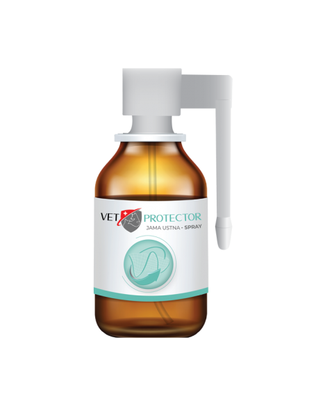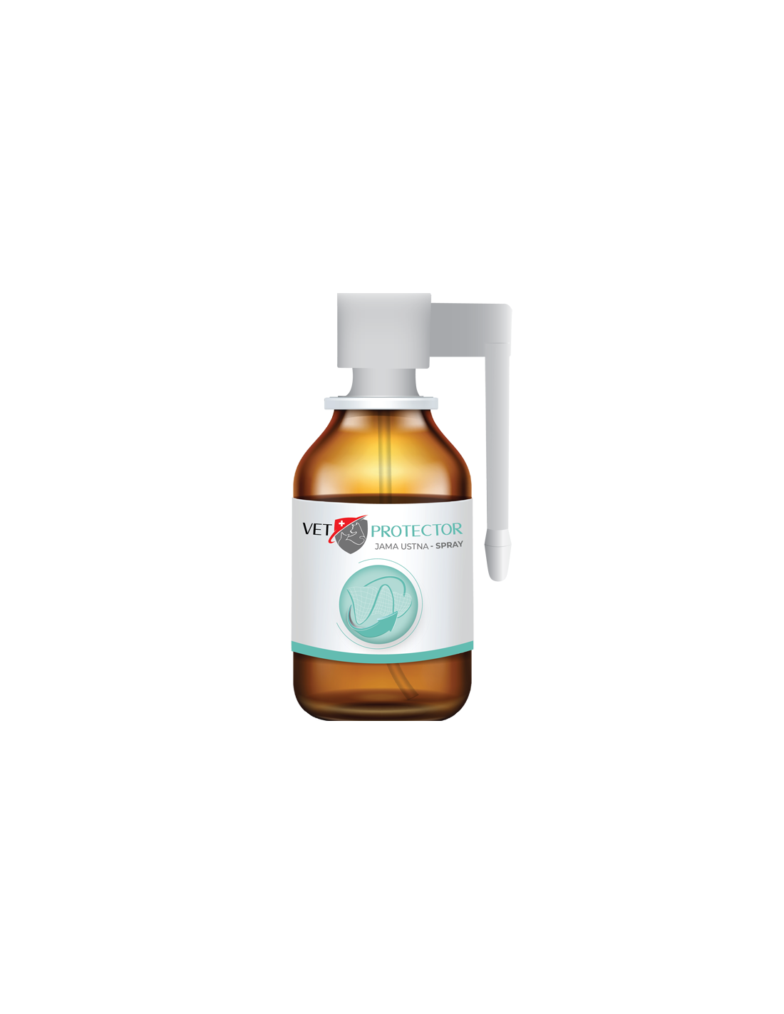 Vet Protector spray do jamy ustnej firmy JM Sante to tiksotropowy płyn stomatologiczny o przedłużonym działaniu, do stosowania u psów i kotów z chorobami błony śluzowej jamy ustnej oraz w limfocytarno-plazmocytarnym zapaleniu dziąsęł u kotów. Codzienna aplikacja produktu ogranicza odkładanie się płytki nazębnej, szczególnie u psów i kotów nietolerujących szczotkowania.
