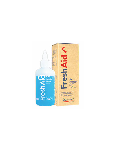 FreshAid - żel do pielęgnacji jamy ustnej dla psa i kota. Wykazuje potrójne działanie: neutralizuje nieprzyjemny zapach, ogranicza tworzenie płytki nazębnej, chroni i regeneruje dziąsła. Opakowanie: 112 ml.