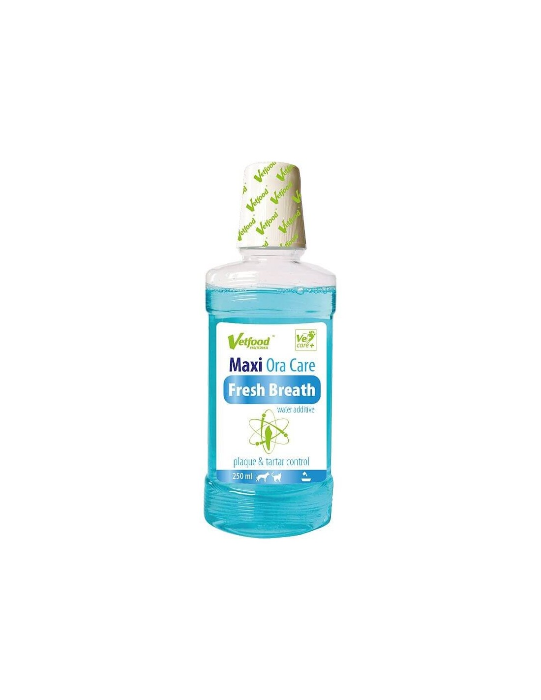 Płyn Maxi OraCare Fresh Breath dla psów i kotów do utrzymania prawidłowej higieny jamy ustnej zwierząt, zawiera zneutralizowany cynk w postaci glukonianu cynku, który ma działanie przeciwzapalne, przeciwbakteryjne, zapobiega tworzeniu się płytki nazębnej oraz usuwa przykry zapach z jamy ustnej. Opakowanie: 250 ml