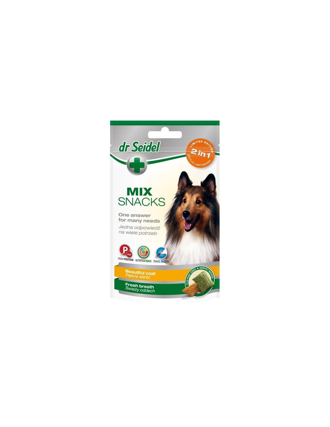 Smakołyki MIX 2w1 dla psów na piękną sierść i świeży oddech dr Seidla to pierwszy na rynku MIX dla psów wzbogacony o dobroczynne substancje w ilościach odpowiadających suplementom diety. Skrzyp polny i cynk poprawiają stan skóry i sierści. Chlorofil i Yucca neutralizują nieprzyjemny zapach z pyska i zmniejszają intensywność zapachu zwierząt oraz ich odchodów. Ciasteczka można rozróżnić po kolorze: zielony – z chlorofilem i Yuccą, oraz brązowy – ze skrzypem i cynkiem.