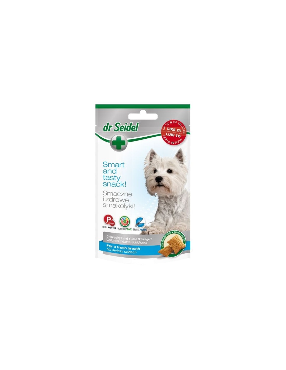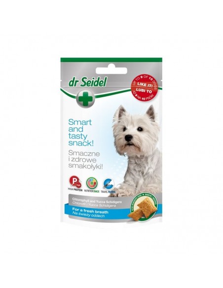 Smakołyki na świeży oddech dr Seidla to pełnowartościowy przysmak dla psów wzbogacony o chlorofil i Yuccę Schidigera. Chlorofil ma właściwości dezodorujące, dzięki czemu neutralizuje nieprzyjemny zapach z pyska. Yucca hamuje rozwój bakterii rozkładających mocznik, przez co zmniejsza intensywność zapachu zwierząt i ich odchodów.