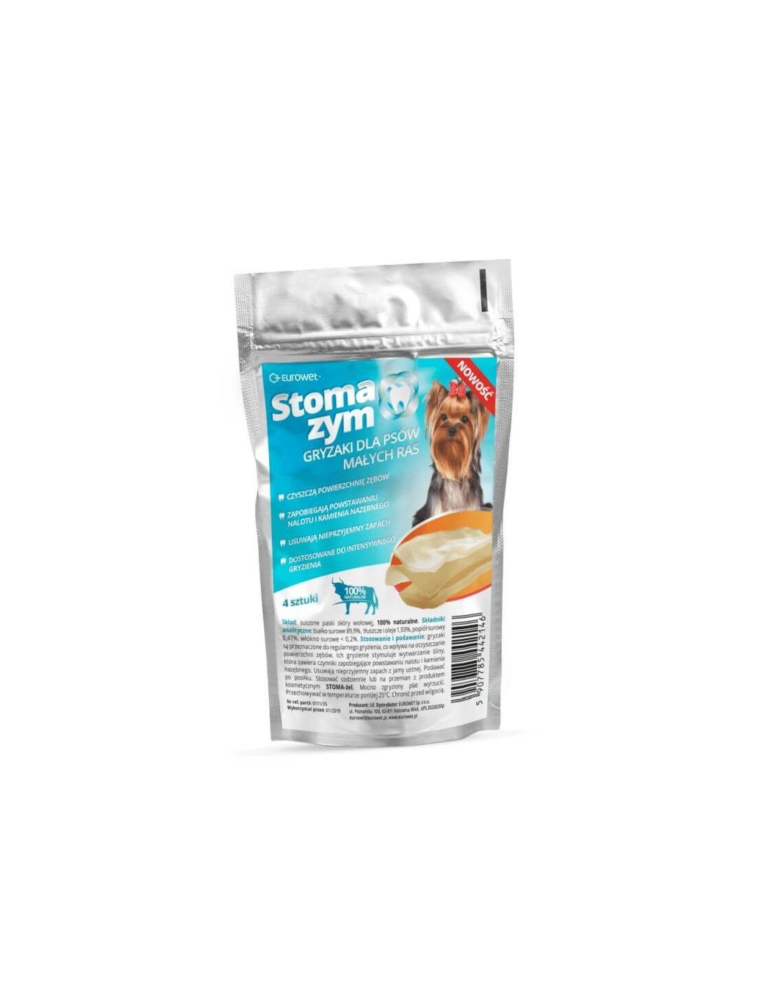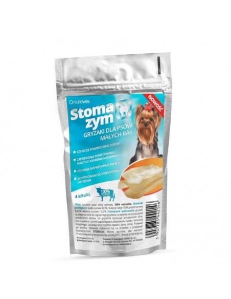 Stoma-Zym - gryzaki stomatologiczne dla psów małych ras. Pomagają redukować nieprzyjemny zapach z jamy ustnej psów dzięki ograniczeniu powstawania bakteryjnej płytki nazębnej i kamienia nazębnego. Opakowanie: 4 gryzaki