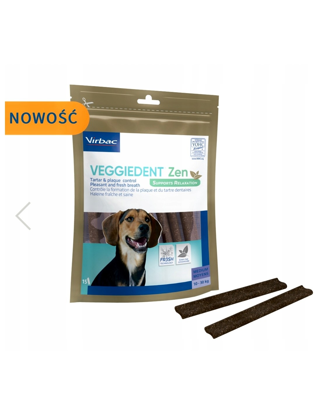 - Gryzaki VEGGIEDENT® ZEN podawane na 2–3 godziny przed epizodem stresu łagodzą jego odczuwanie (np. wizyta u lekarza weterynarii) (2)