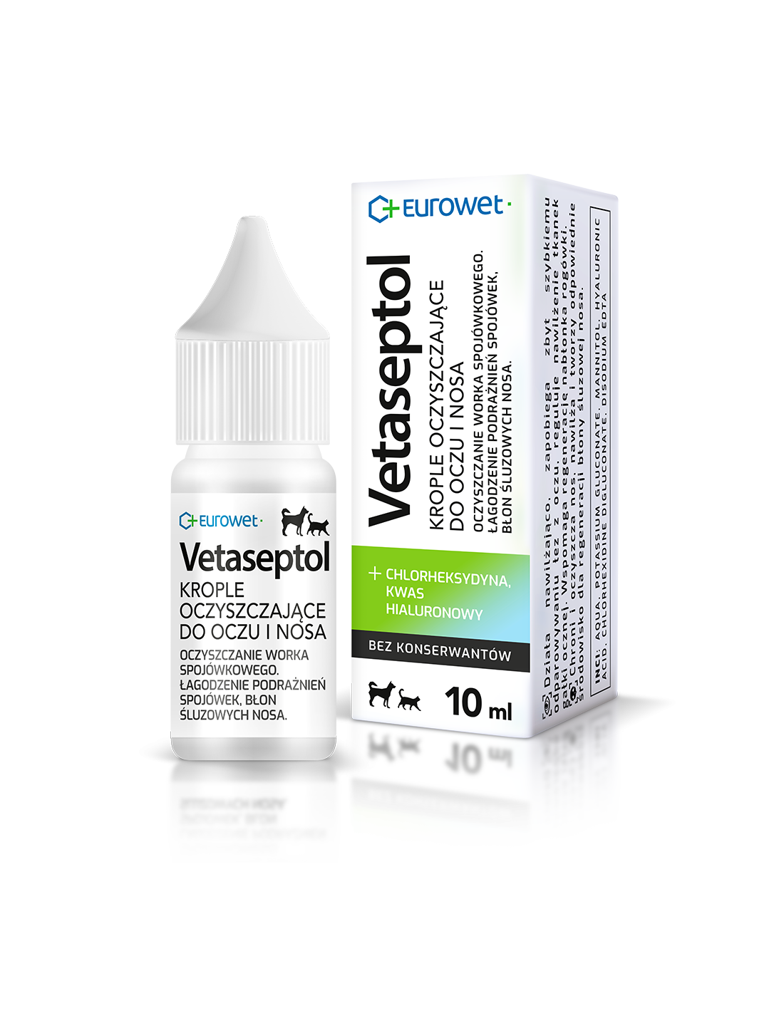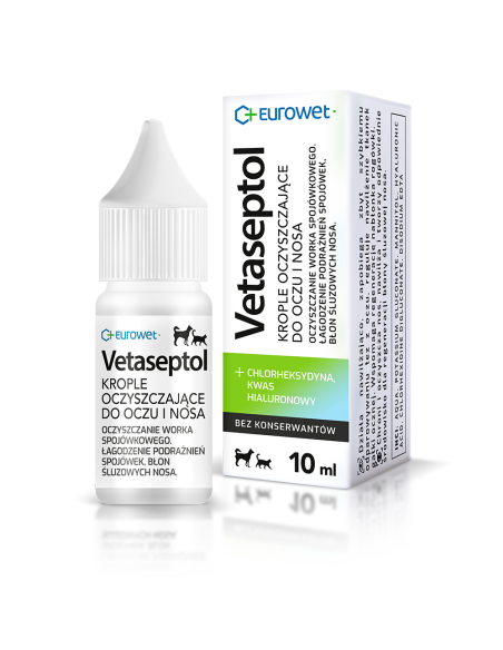 Vetaseptol - krople do higieny, czyszczenia oczu i okolicy nosa dla kotów i psów. Krople zawierają chlorheksydynę o działaniu antyseptycznym. Krople łagodzą podrażnienia spojówek oraz pomagają usunąć zanieczyszczenia z worka spojówkowego. Dodatkowo, nawilżają spojówki, ograniczają ich obrzęk.
