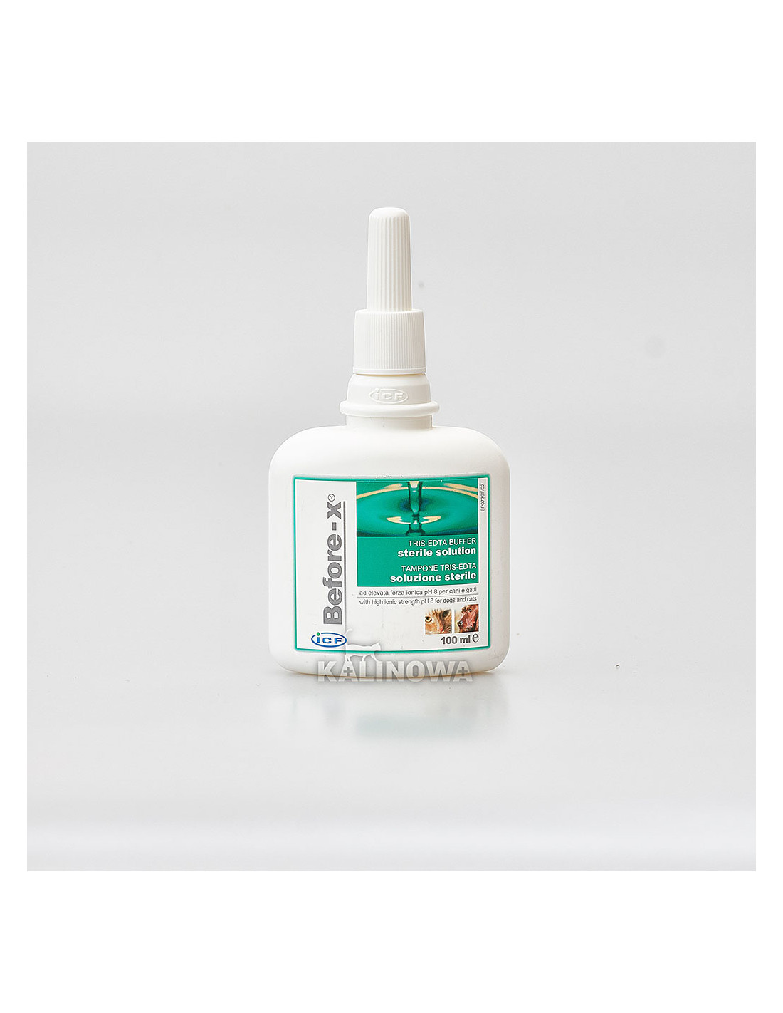 Before X - roztwór Tris-EDTA do stosowania zewnętrznego u psów i kotów. Główne przeznaczenie to profilaktyka i wspomaganie leczenia zapaleń przewodów słuchowych, przestrzeni międzypalcowych. Tris-EDTA stosuje się w celu zwiększenia skuteczności działania innych preparatów, w tym, antybiotyków. Before X stosuje się przed zastosowaniem leku podstawowego. Opakowanie: 100 ml.