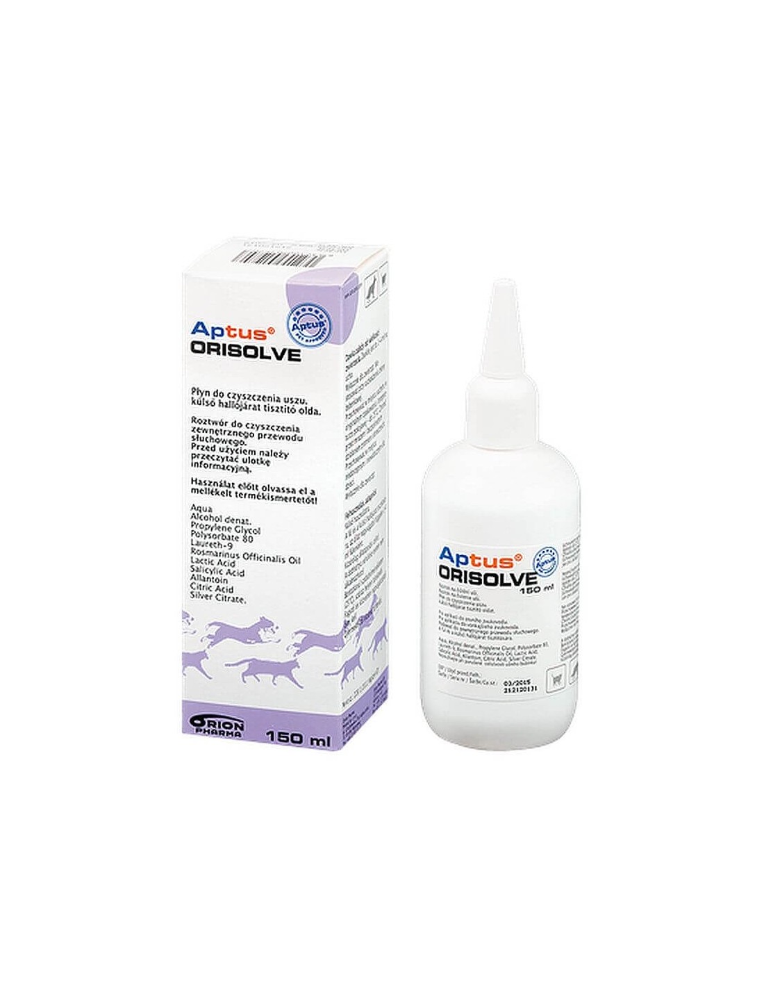 Orisolve Aptus - jony srebra w preparacie do czyszczenia uszu psów i kotów. Preparat zawiera składniki: rozpuszczające woszczynę, o właściwościach przeciwbakteryjnych, przeciwgrzybiczych, lokalnie odczulających, łagodzących i regenerujących. Opakowania: 150 ml.