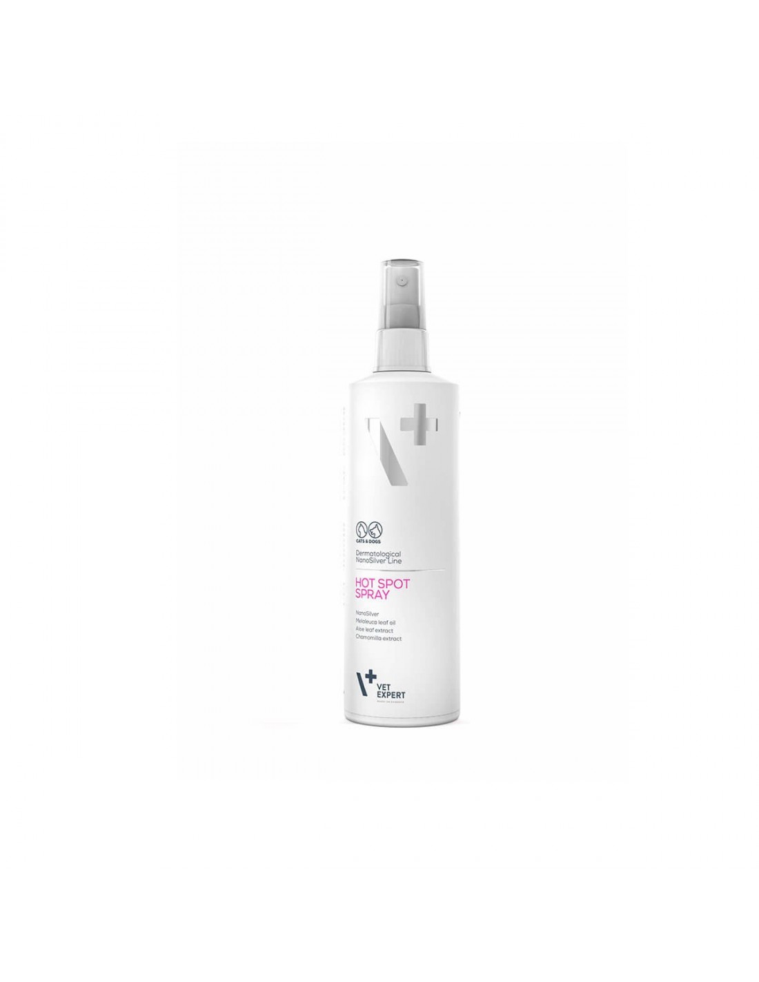 NanoSilver HOT SPOT Spray to preparat z linii Dermatological NanoSilver Line wiodącej na rynku światowym marki VetExpert. Spray HOT SPOT jest dedykowany psom i kotom z problemami dermatologicznymi. Przeznaczony do stosowania miejscowego w pielęgnacji zmian skórnych typu hot spot - powierzchowne ropne zapalenie skóry. Zawiera nanosrebro, pantenol, aloes, ekstrakt z rumianku i olejek z drzewa herbacianego.