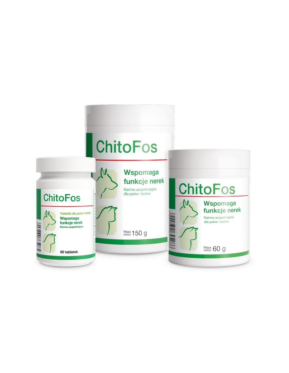 ChitoFos Dolfos - stosuje się u psów i kotów cierpiących na przewlekłą niewydolność nerek. ChitoFos zawiera chitosan i węglan wapnia, który pozwala na obniżenie poziomu fosforu. Opakowanie: proszek 150 g.