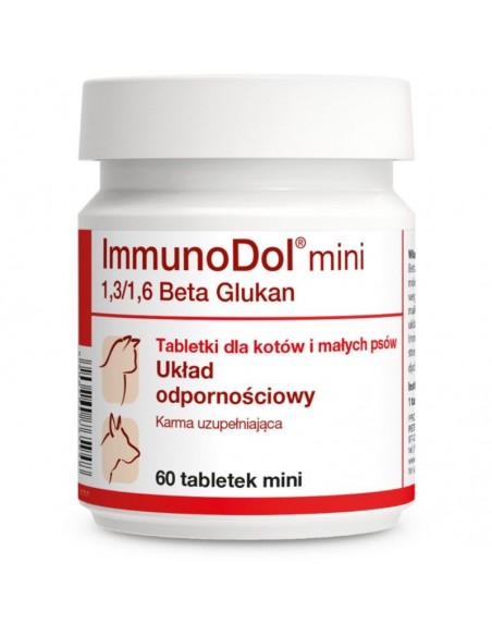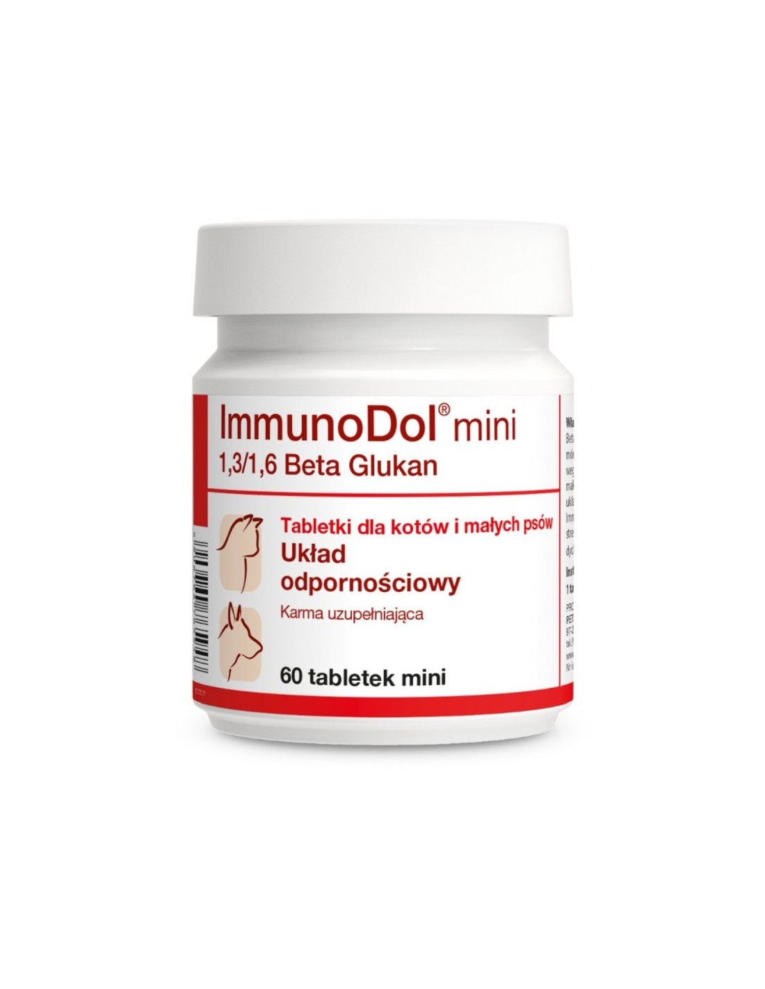 ImmunoDol mini Dolfos dla kotów i małych psów. Preparat stymuluje układ odpornościowy, zawiera beta-1,3/1,6-glukan. ImmunoDol stosuje się w trakcie rekonwalescencji, w sytuacjach stresowych, przy obniżonej odporności. Opakowanie: 60 tabletek.