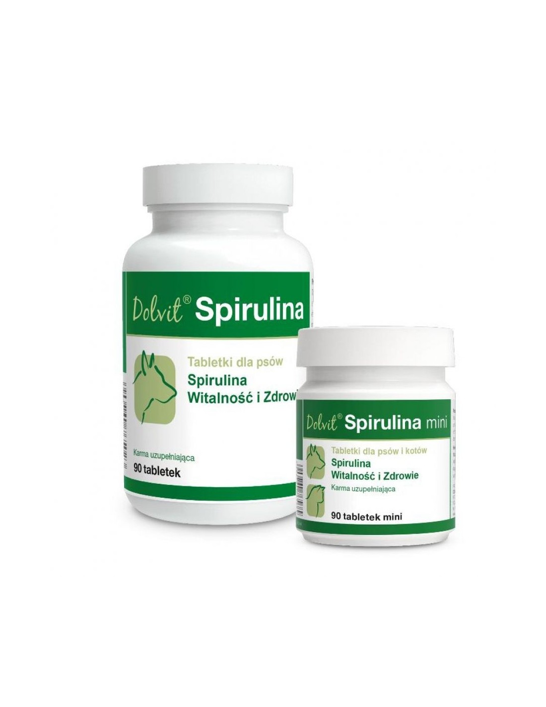 Spirulina Mini Dolvit - preparat dla kotów i małych psów - 1 tabletka na 3 kg masy ciała zwierzęcia dziennie. Preparat zawiera spirulinę bogatą w wysokiej jakości białko, a także witaminy, minerały i inne składniki odżywcze, które wzmacniają układ odpornościowy, poprawiają pracę przewodu pokarmowego. Opakowanie: 90 tabletek mini.