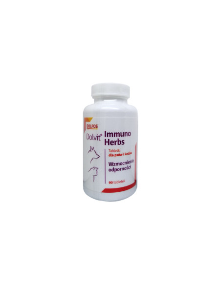 Dolvit  Immuno Herbs to preparat zwiększający odporność psów i kotów. Zawarte w nim składniki – kompozycja ekstraktów roślinnych, prebiotyki, witaminy i minerały, wzmacniają układ immunologiczny, wspomagają prawidłowe funkcjonowanie dróg oddechowych, mają działanie antyoksydacyjne. Preparat stosuje się przy obniżonej odporności, osłabieniu organizmu, w sezonie infekcyjnym, wspomagająco w infekcjach górnych dróg oddechowych.