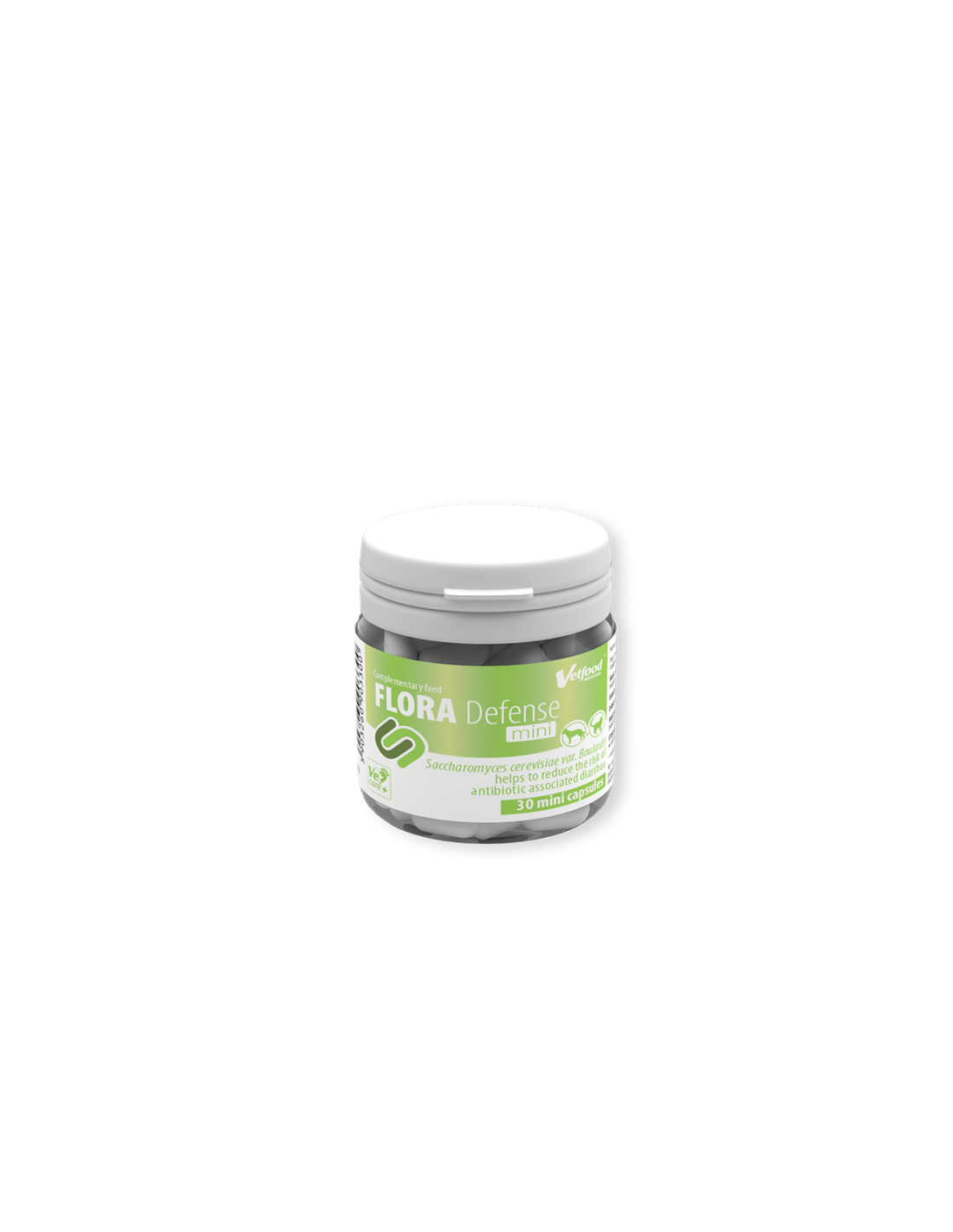 FLORA Defense mini - dedykowana jest zwierzętom o wadze do 5 kg masy ciała. Zawiera czyste kultury drożdży Saccharomyces boulardii i bakterie kwasu mlekowego Lactobacillus rhamnosus LR06 oraz prebiotyk (oligofruktoza). Opakowanie: 30 kapsułek