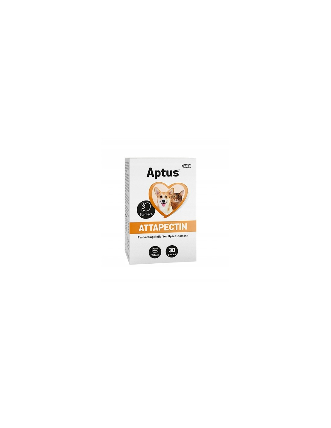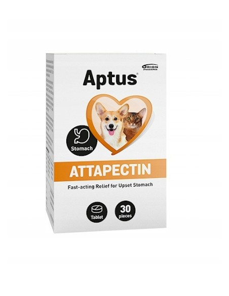 Attapectin Aptus tabletki dla psów i kotów stosowane w przypadkach niestrawności. Glinka kaolinowa, pektyna chronią ścianę przewodu pokarmowego, wiążą toksyny bakteryjne i produkty fermentacji oraz ułatwią ich transport i wydalenie. Opakowanie: 30 tabletek.