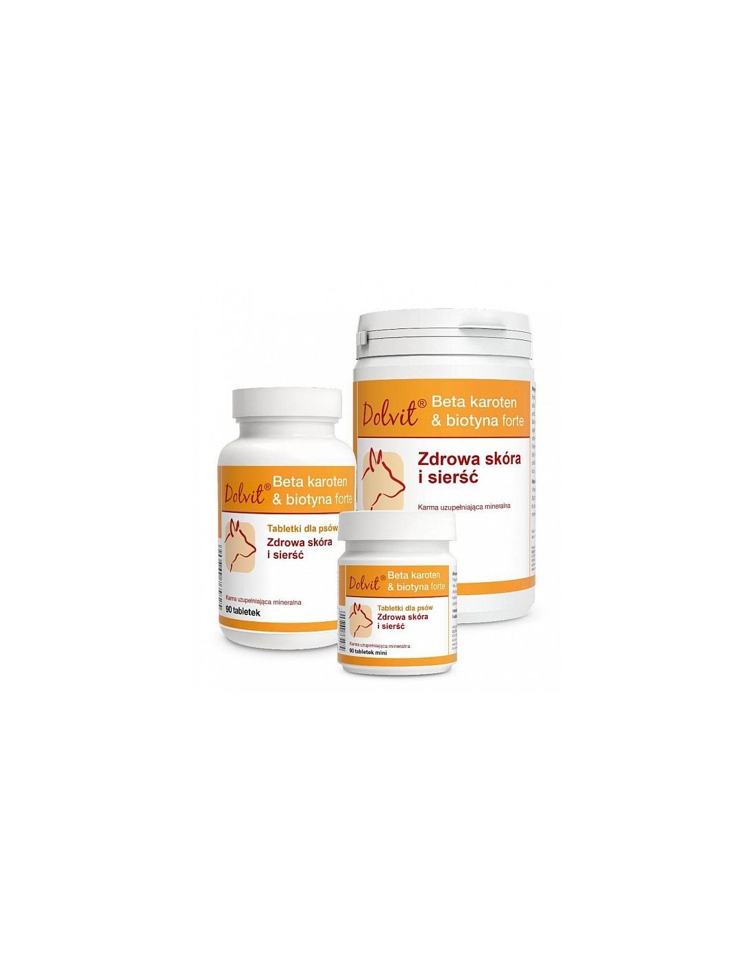Dolvit Beta karoten i biotyna forte -preparat zawiera biotynę, aminokwasy, cynk w formie organicznej (chelatowej) i nieorganicznej - składniki niezbędne dla prawidłowego rozwoju i formowania okrywy włosowej oraz beta karoten (prowitaminę A). Beta karoten pogłębia kolor włosa, poprawia wzrok. Zawarte w preparacie drożdże piwne są źródłem naturalnych witamin z grupy B i innych cennych składników. Preparat szczególnie zalecany jest dla długowłosych ras psów, w tym zwłaszcza suk po zakończonym okresie karmienia i odchowie szczeniąt. Poleca się również używać go w okresach linienia, przy przesuszonej skórze, nadmiernym złuszczaniu naskórka, wypadaniu, matowości i wzmożonej łamliwości włosa.