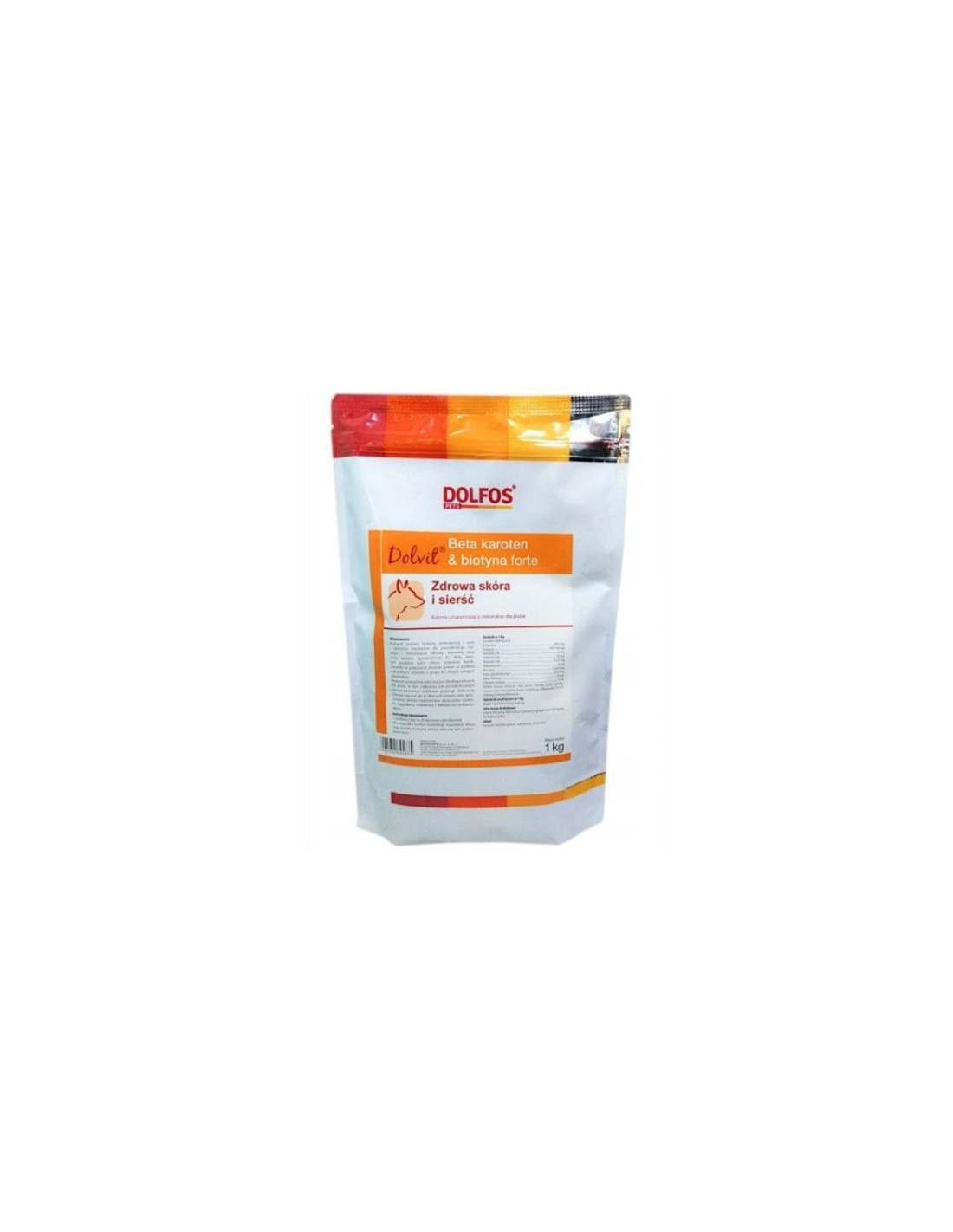 Dolvit Beta karoten i biotyna forte - preparat dla psów zawierający beta karoten (prowitaminę A), biotynę, aminokwasy, cynk w formie organicznej (chelatowej) i nieorganicznej - składniki niezbędne dla prawidłowego rozwoju i formowania okrywy włosowej. Stosować w okresach linienia, przy przesuszonej skórze, nadmiernym złuszczaniu naskórka, wypadaniu, matowości i wzmożonej łamliwości włosa. Opakowanie: proszek, torebka 1000 g.
