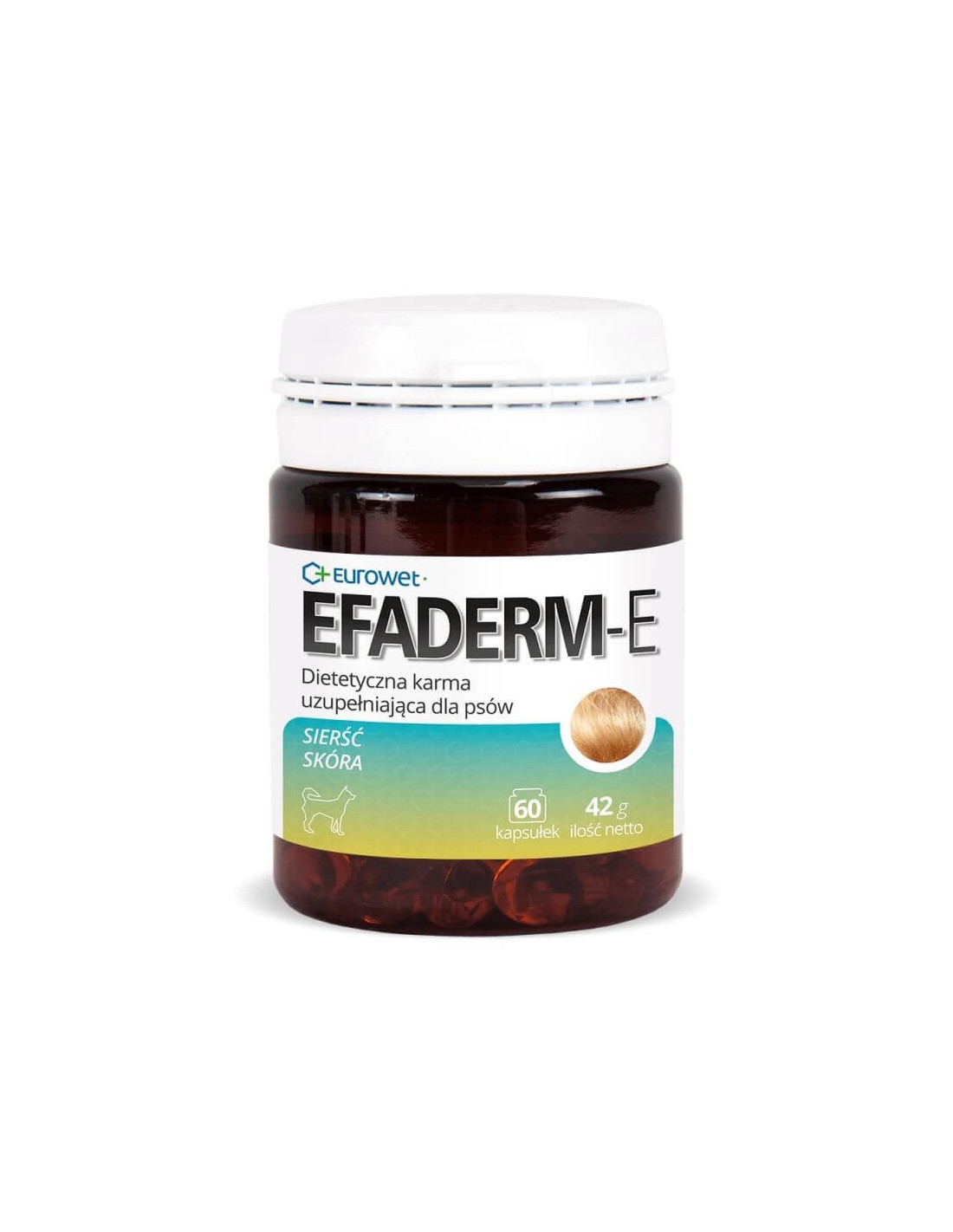 Efaderm E to preparat w postaci miękkich kapsułek bogaty w odżywcze oleje rybne, zawierające kwasy omega-3 i ekstrakt naturalnych tokoferoli. Zaleca się podawanie go psom z problemami dermatologicznymi, z suchą, łamliwą, wypadającą sierścią. Efaderm E wspomaga naturalne procesy odbudowy skóry oraz przywraca sierści blask i ogranicza jej wypadanie. Szczególnie przydatny do stosowania w przypadku stanów zapalnych skóry.