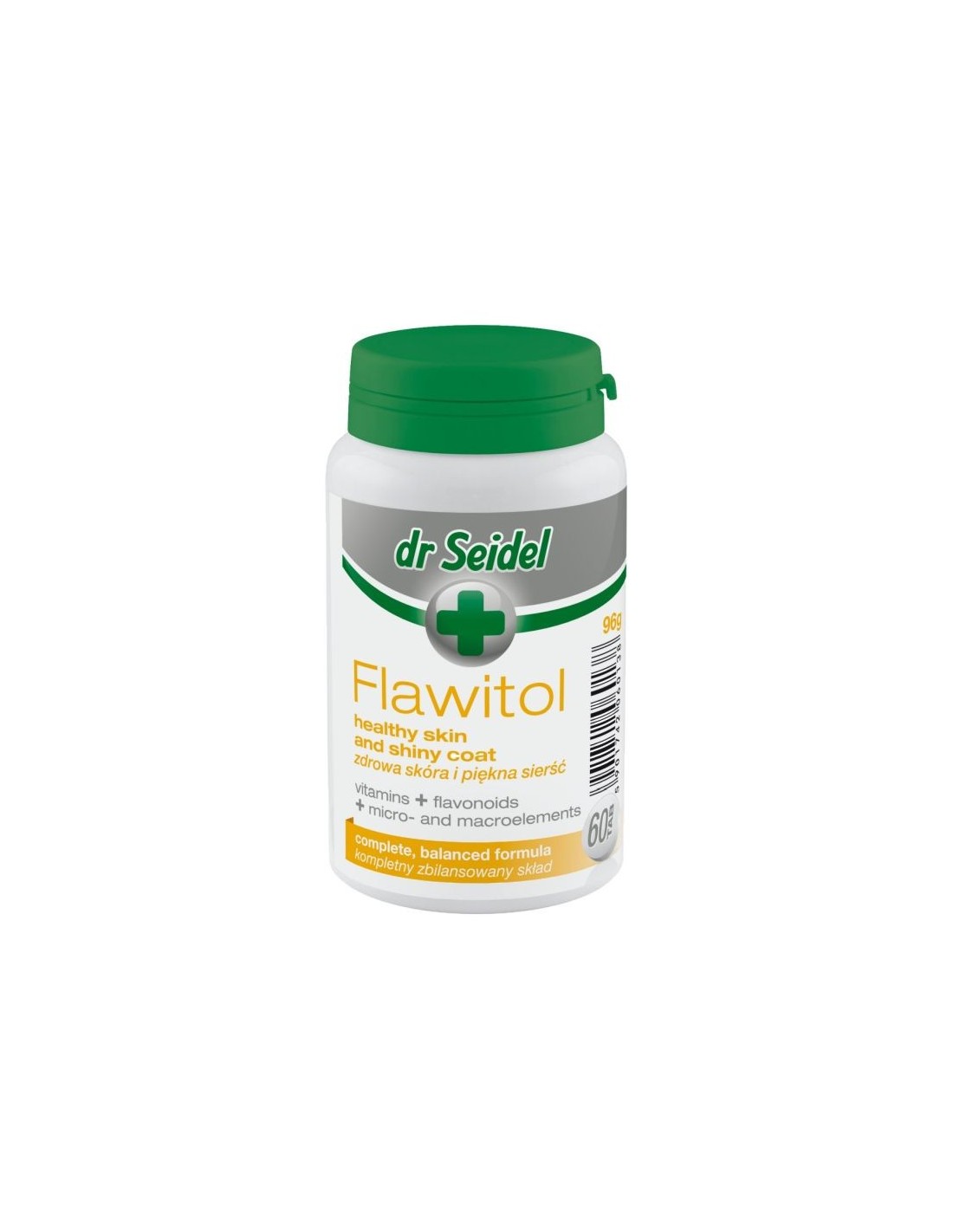 Flawitol zdrowa skóra i piękna sierść – zapewnia prawidłowy stan skóry, dzięki zawartości cynku, biotyny, kwasu pantotenowego oraz witamin A i E. Dodatek flawonoidów w preparacie zwiększa odporność organizmu na wiele chorób (w tym nowotworowych) i opóźnia procesy starzenia. Zapobiega wysuszeniu i nadmiernemu łuszczeniu się skóry. Daje piękną, błyszczącą sierść. Opakowanie: 60 tabl.