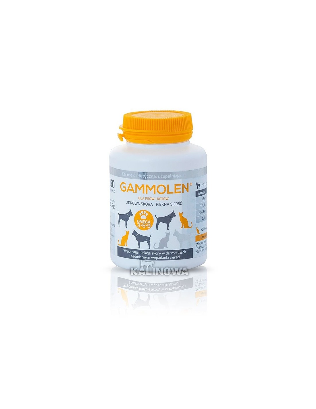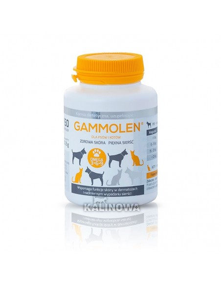Gammolen to suplement diety dla psów i kotów. Jest unikalną kompozycją olejów roślinnych, w której proporcje kwasów tłuszczowych omega 6 i omega 3 zostały specjalnie dobrane dla uzyskania najlepszego efektu. Gammolen został stworzony, by zwalczać nie tylko objawy, ale i przyczyny chorób skóry u zwierząt. Od lat rekomendowany jest przez specjalistów, jako doskonałe rozwiązanie w przypadku dermatozy u psów i kotów, oraz sprawdzony preparat na wypadającą sierść. Oparta na specjalnych olejach receptura nie uczula zwierzęcia i nie powoduje podrażnień.