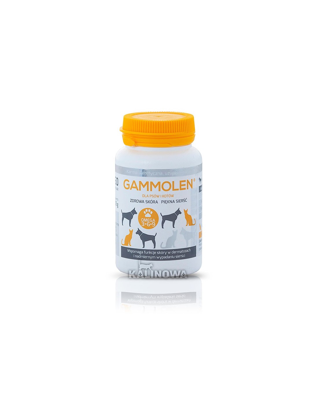 Gammolen - suplement diety dla psów i kotów. Jest unikalną kompozycją olejów roślinnych, w której proporcje kwasów tłuszczowych omega 6 i omega 3 zostały specjalnie dobrane dla uzyskania najlepszego efektu. Opakowanie: 60 kaps.
