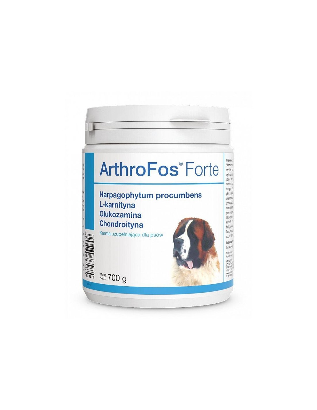 ArthroFos Forte - preparat dla psów z glukozaminą, chondroityną, L-Karnityną, czarcim pazurem, witaminą C, manganem, miedzią. Wspomaga prawidłowe funkcjonowanie stawów. Polecany szczególnie dla psów młodych dużych ras w okresie intensywnego wzrostu, jak i dla starszych psów. Opakowanie: proszek 700 g.