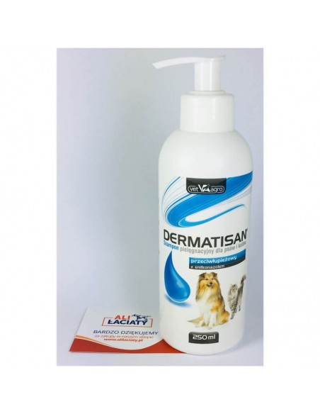 Dermatisan szampon przeciwłupieżowy z enilkonazolem dla psów i kotów. Preparat przeznaczony jest do pielęgnacji skóry i sierści ze skłonnością do grzybiczych stanów zapalnych. Opakowanie: 250 ml.