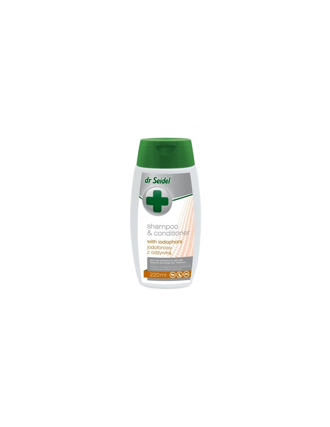 Szampon Dr Seidla jodoforowy z odżywką dla psów, kotów, fretek i gryzoni. Do stosowania w czasie terapii zapalenia skóry i świądu wywołanego zakażeniami grzybiczymi i bakteryjnymi. Szampon zawiera dodatkowy kompleks składników poprawiających wygląd sierści. Opakowanie: 220 ml.