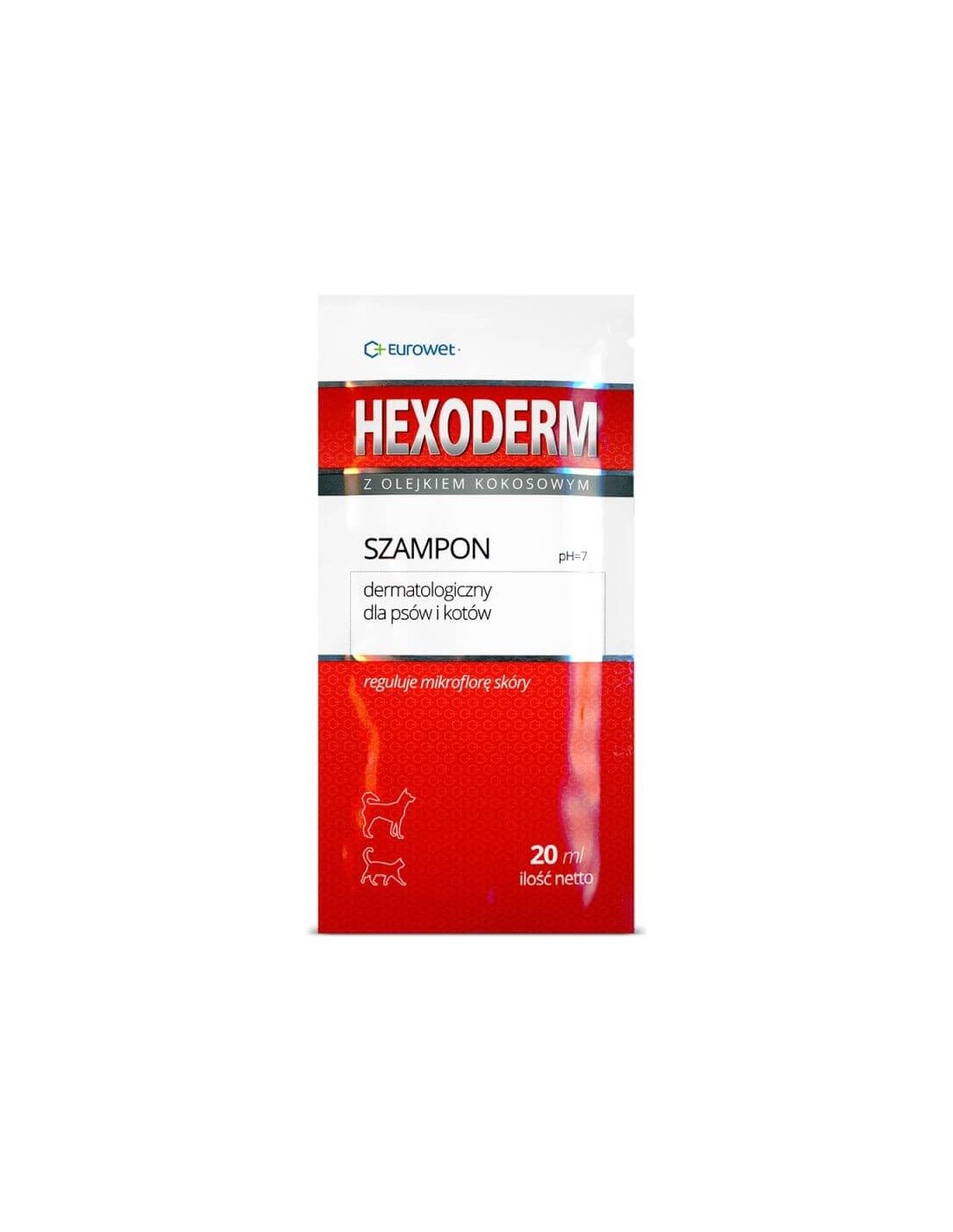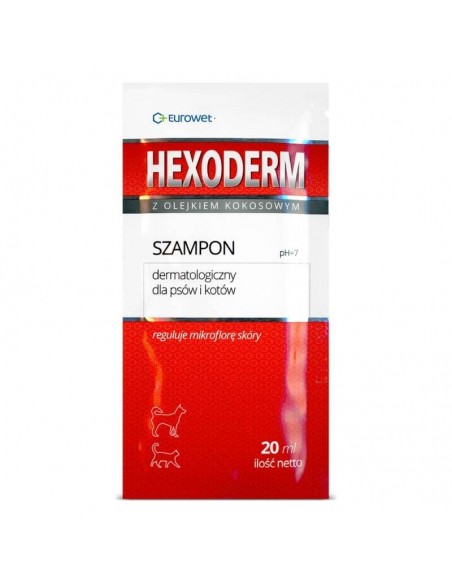 Hexoderm łagodny szampon z chlorheksydyną i olejkiem kokosowym dla psów i kotów regulujący mikroflorę skóry, zapobiegający jej wysuszaniu i stabilizujący pH. Łagodne środki myjące pozwalają na częste stosowanie. Opakowanie: saszetka 20 ml.