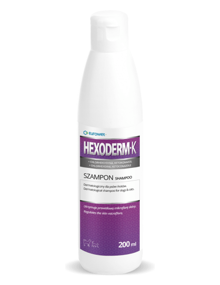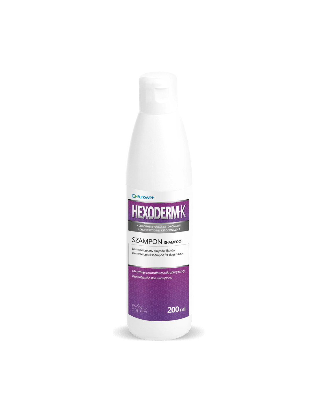 Hexoderm K łagodny szampon z chlorheksydyną i olejkiem kokosowym dla psów i kotów regulujący mikroflorę skóry, zapobiegający jej wysuszaniu i stabilizujący pH. Łagodne środki myjące pozwalają na częste stosowanie. Opakowanie: 200 ml.