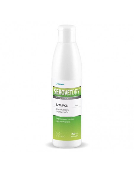Sebovet Dry - szampon dla psów i kotów z łojotokiem suchym, objawiającym się łupieżem. Łagodzi podrażnienia skóry, przywraca jej elastyczność i prawidłowe nawilżenie. Wskazany do stosowania przy sierści matowej, suchej, ze skłonnościami do łamania się włosa. Opakowanie: 200 ml