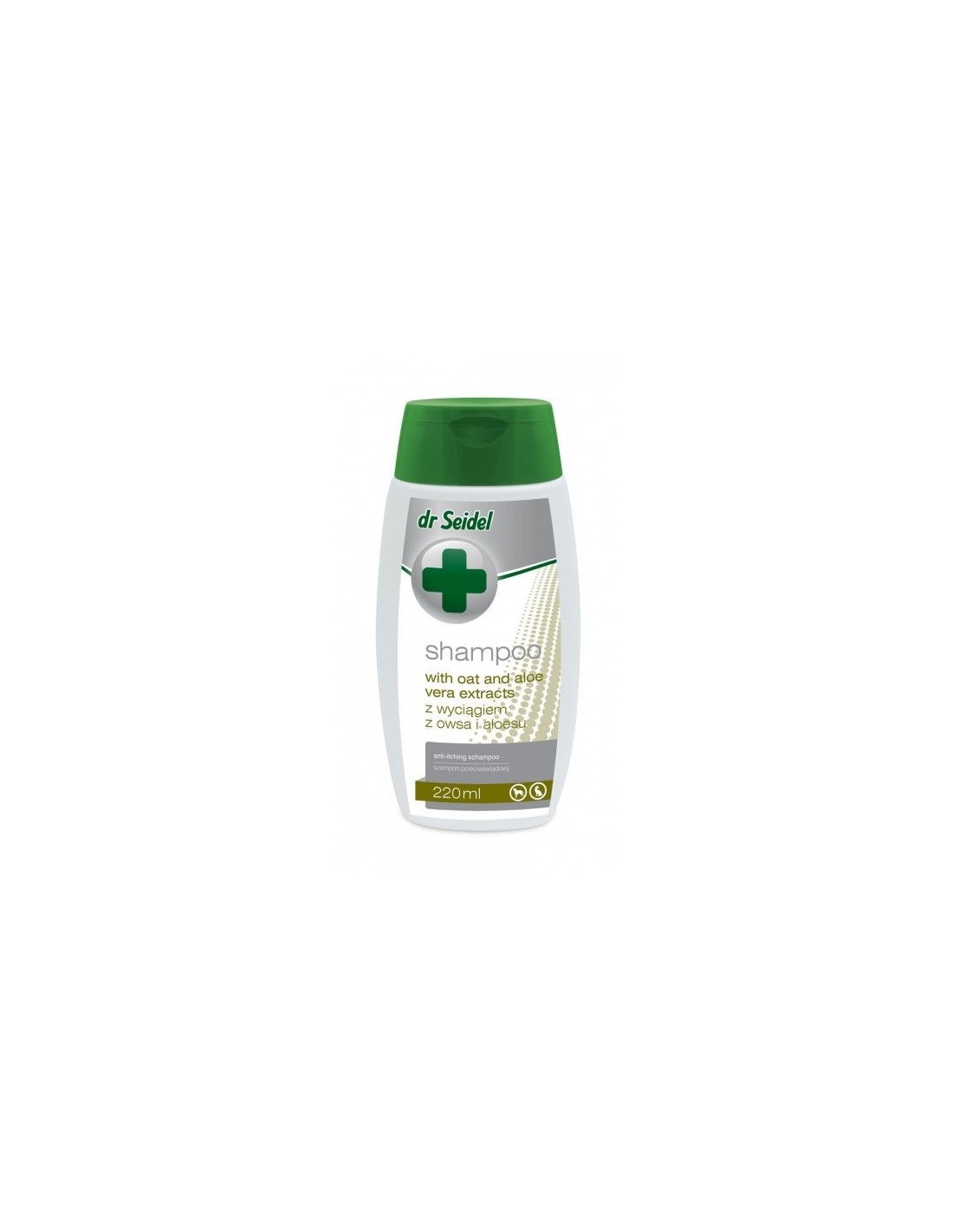 Szampon Dr Seidla z wyciągiem z owsa i aloesu dla psów i kotów o działaniu przeciwświądowym do pielęgnacji skóry przesuszonej i skłonnej do podrażnień. Opakowanie: 220 ml.