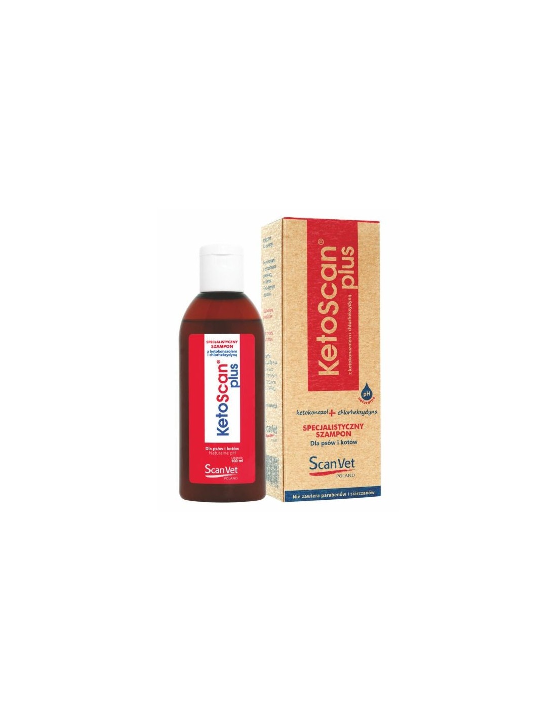 KetoScan Plus ScanVet - szampon leczniczy dla psów i kotów z chlorheksydyną i ketokonazolem, substancjami hamującymi wzrost bakterii i grzybów w tym drożdżaków. Produkt przeznaczony jest do pielęgnacji skóry ze skłonnością do łupieżu, dermatoz i stanów zapalnych tła bakteryjnego i grzybiczego, dokładnie oczyszcza skórę i okrywę włosową. Opakowanie: 100 ml.
