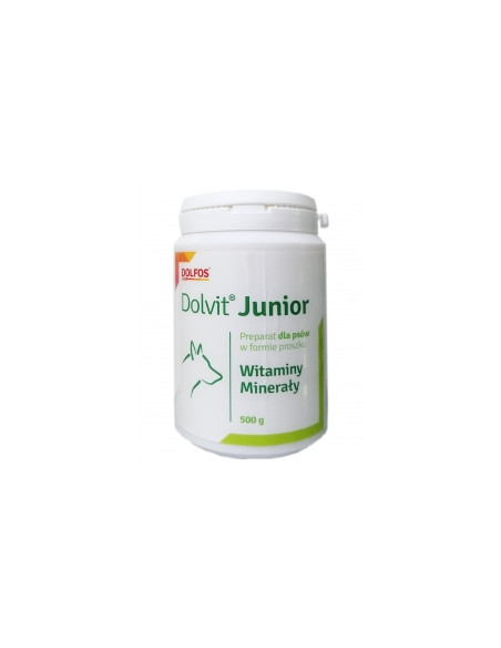 Dolvit Junior - witaminowo-mineralny preparat dla szczeniąt i młodych psów. Zawarte w preparacie składniki wpływają korzystnie na kondycję ogólną i okrywę włosową. Prawidłowo zbilansowane makroelementy (wapń i fosfor) zapewniają harmonijny rozwój układu szkieletowego. Zaleca się stosowanie preparatu jako dodatku uzupełniającego zarówno niedobory makro- i mikroelementów jak też witamin, przez cały okres wzrostu szczeniąt, począwszy od 3 tygodnia życia.